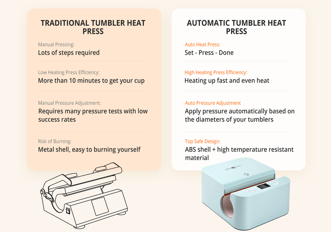 No manual or repetitive pressing is required. With just one click, the Auto Tumbler Heat Press automatically applies the perfect amount of pressure based on the diameters of your tumblers.
