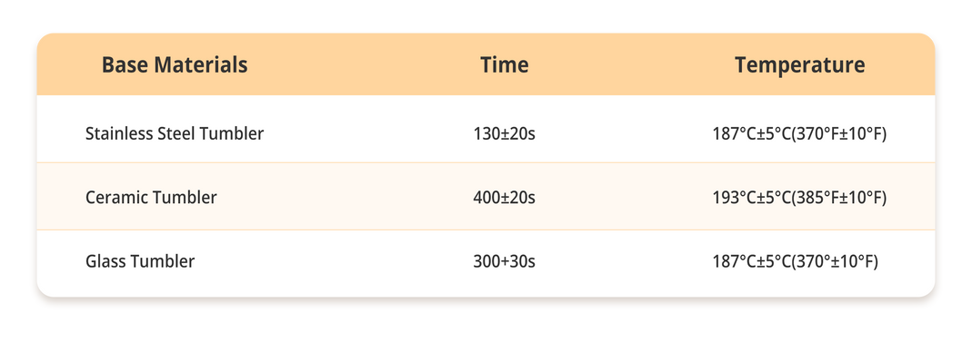 Thanks to its longer and larger heat plate, this heat press is compatible with a wide range of mugs, tumblers, glass tumblers, cups, water bottles, and sippy cups. It accommodates tumblers with a maximum diameter of 2.95-3.18in(7.5-8.1cm) and a volume of 10-30 oz(280-850 ml).