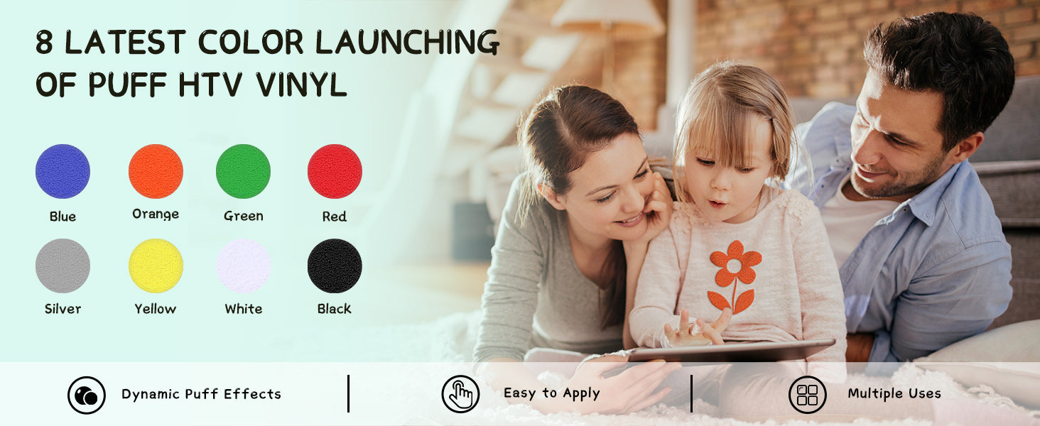 HTVRONT Puff Vinyl Heat Transfer, With 8 sheets in assorted colors and 1 bonus teflon sheet, gives you endless options for customizing your t-shirts and other fabrics. Our Puff HTV Vinyl bundle lets you create stunning 3D designs that pop! You'll have everything you need to bring your ideas to life.