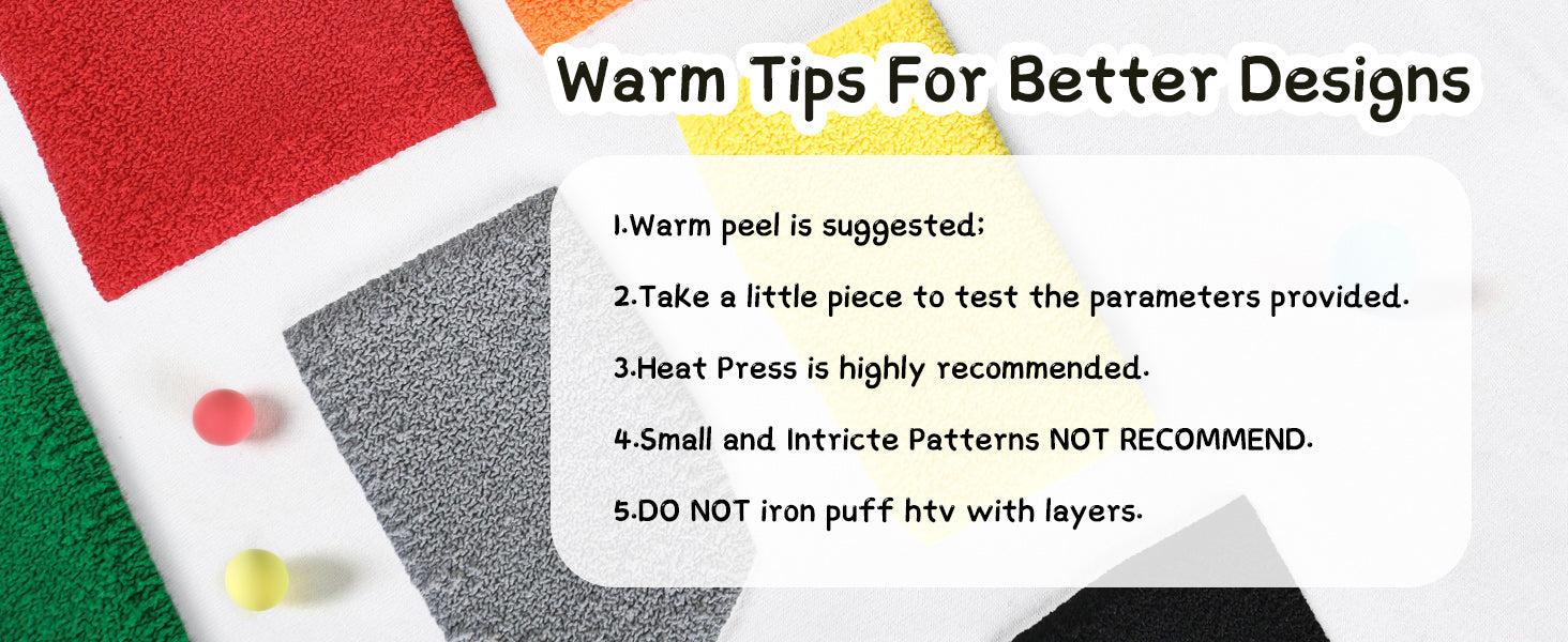 For better Puff Effects, we strongly recommend you to do a Pre-Iron Test before use, because the press/heating parameters may be slightly different due to different machines and conditions, and the puff effects may also change due to different parameters. If you have any concerns or problems, we are always here to help!